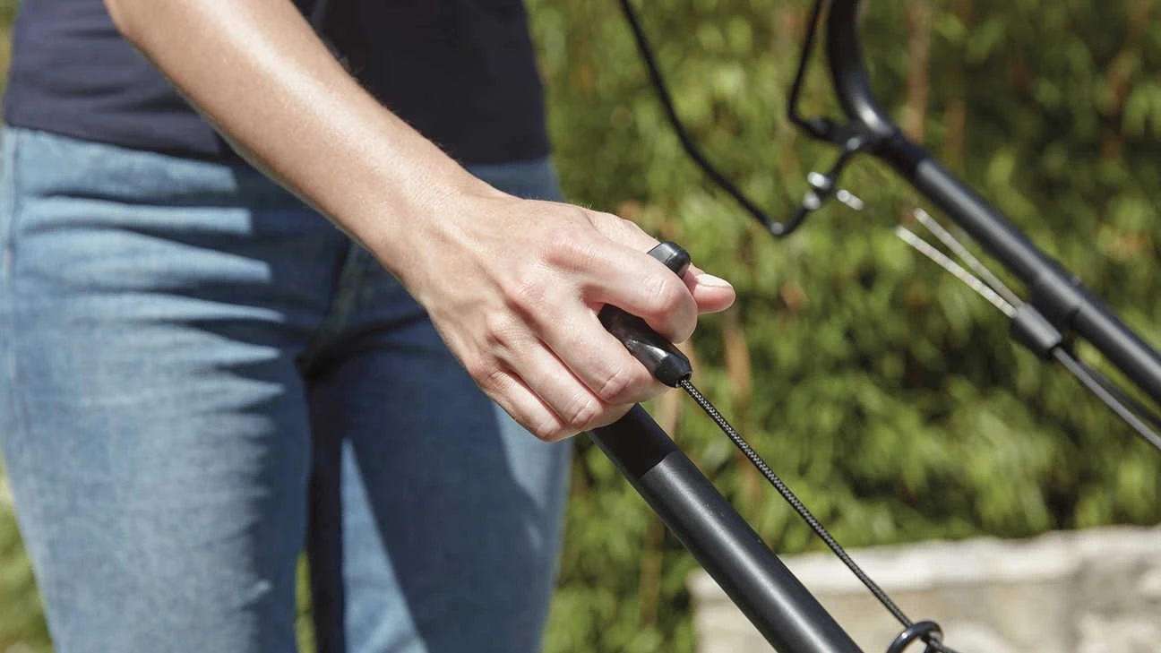 Een duwmaaier op benzine met een grote grasvangzak van 42 liter en een stalen maaidek van 41 cm voor een mooi gemaaid gazon.
