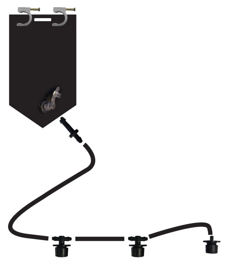 Irrigatiesysteem bestaat uit: 10l waterzak, 6 meter slang, 1 x verbindingspijp, 7 x T-vormige druppelaars, 1 x eind druppelaar, 2 x haken met schroef. Gebruiksaanwijzing