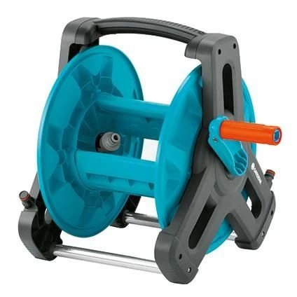 Voor praktisch transporteren en bewaren van de slang. Stabiel door 3-punts zijkantverbinding. Afgeronde slangaansluiting voorkomt knikken van de slang. Draaiende, gelagerde aansluitas voorkomt meedraaien van de aansluitslang. Met inklapbare, vrijlopende handzwengel.