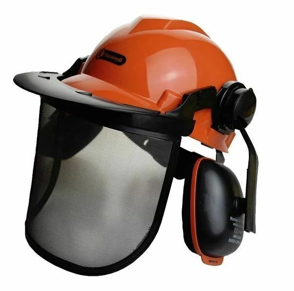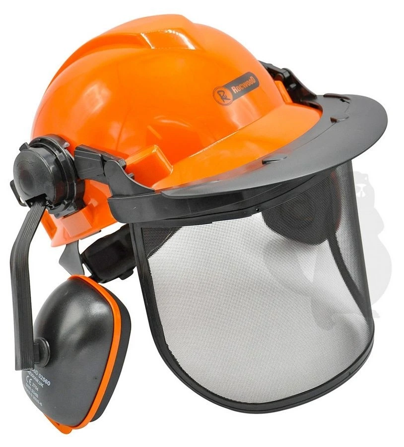 Veiligheidshelm bosbouwt set bestaande uit helm (EN397), oorkleppen 23 dB (EN352-3), nylon gaas vizier (EN1731 S). Standarden EN352-3, EN1731S, EN397.